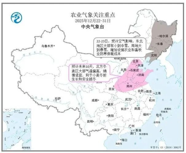 12月22日至25日,受冷空气影响,我国大部地区气温下落4℃至6℃,局地8℃至10℃,并伴有6至8级阵风,华北中北部、东北地区等地有小到中雪或雨夹雪,东北局地大到暴雪;29日至30日还将有冷空气影响我国长江以北大部地区,降温风雪天气对要领农业坐褥、畜生转场和饲料运载不利,增多防寒御寒老本。南边大部气温偏高1℃至4℃,利于冬小麦、油菜的孕育以及露地蔬菜和经济林果的老练采收,22日至25日西南地区东部、江汉南部、江南、华南西部等地有小到中雨,利于补充泥土水分、增多库塘蓄水。