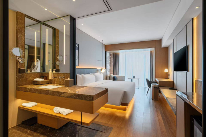 咱们水晚上抵达,一进酒店就能感受到它显著的气派。酒店的贪图主打“新当代方针”,大堂空间活泼怒放,好意思妙地用原木、石材和光影营造出高档感。